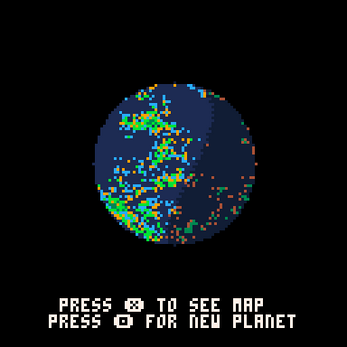 h=true cls()::s::w,o,r,l,u,d=128,128,{[0]=7},34,30,60repeat for x=o,w,o*2 do for y=o,w,o*2 do a=0 for i=-1,1,2 do for j=-1,1,2 do a+=r[(x+i*o)%w+w*((y+j*o)%128)] end end r[x+w*y]=min(max(a\4+3-rnd(6),1),14) end end p=false for y=0,w,o do for x=p and 0 or o,w,o*2 do a=0for j in all({{0,1},{-1,0},{1,0},{0,-1}}) do a+=r[(x+j[1]*o)%w+w*((y+j[2]*o)%128)] end r[x+w*y]=min(max(a\4+3- rnd(6),1),14)end p=not p end o/=2until o<1function g(x,y)return (p[flr(r[x+128*y])] or 0)+(w/2*sin(x/w+(t()+6)/14)+w/2<y and 7 or 0) end p={1,1,1,1,1,2,3,4,4,4,5,5,6,7} pal({[0]=0,1,12,9,11,3,6,7,129,129,4,3,13,5,6},1) n=0::_::if h then for x=(n%3),w,2 do for y=(n%2),w,2 do pset(x,y,g(x,y)) end end else for x=0,d do c=x*2/d-1 for y=(n%2),d,2 do b=y*2/d-1 z=b*b if c*c+z>1 then goto q end m=c/sqrt(1-z) pset(x+l,y+u,g(ceil(n+(m+m*m*m/6+1)*32)%w,ceil((b+b*z/6+1.1)*48)%w))::q::end end end n+=1 if btnp(5) then cls()h=not h end ?" press ❎ to see "..(h and "globe" or "map").."\npress 🅾️ for new planet",18,110,7